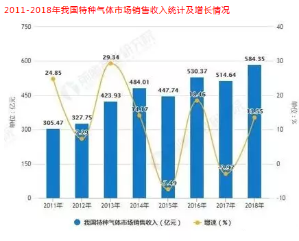 2011-2018年我國(guó)特種氣體市場(chǎng)銷售收入統(tǒng)計(jì)及增長(zhǎng)情況