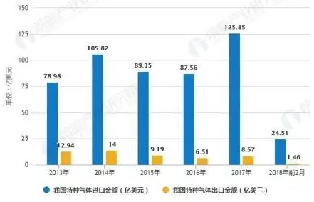 從特種氣體進(jìn)出口金額來看,我國(guó)特種氣體主要以進(jìn)口為主,進(jìn)口金額遠(yuǎn)遠(yuǎn)超過出口金額,截止2018年2月,我國(guó)特種氣體進(jìn)出口金額分別為24.51億美元、1.46億美元。