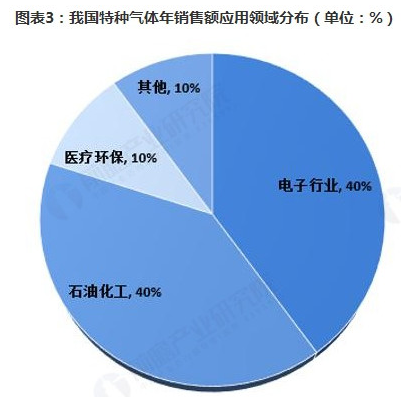 據(jù)相關(guān)數(shù)據(jù)統(tǒng)計,目前,在我國特種氣體年銷售額中,電子行業(yè)約占40%,石油化工約占40%;醫(yī)療環(huán)保約占10%,其它約占10%。
