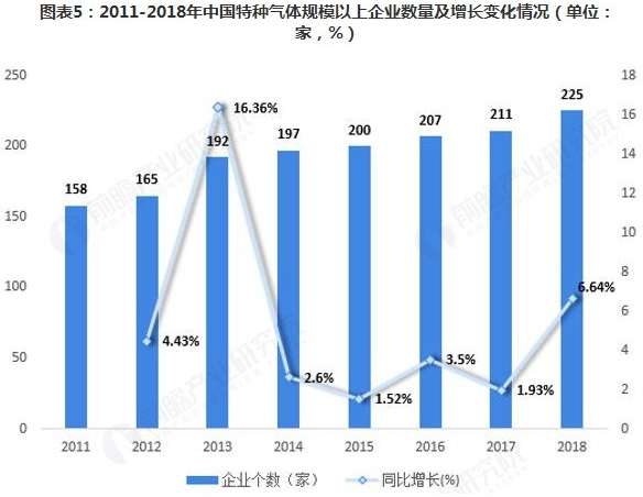 中國的特種氣體企業(yè)市場規(guī)模普遍不大,大多數(shù)企業(yè)為中小型企業(yè)。從企業(yè)性質(zhì)來看,在中國氣體行業(yè)中占據(jù)重要地位的是三資企業(yè)和民營企業(yè)。截至2017年底,我國特種氣體行業(yè)規(guī)模以上企業(yè)數(shù)量達到211家,較上年增加4家。保守估計2018年我國特種氣體企家數(shù)量為225家。