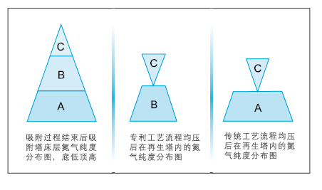 該流程對傳統(tǒng)工藝流程下均壓位置作了改進(jìn)。提高了氮?dú)饣厥章屎吞挤肿雍Y利用率,降低了能耗,改變了利用變壓吸附不能制取高純氮?dú)?99.9995%N2)的歷史。